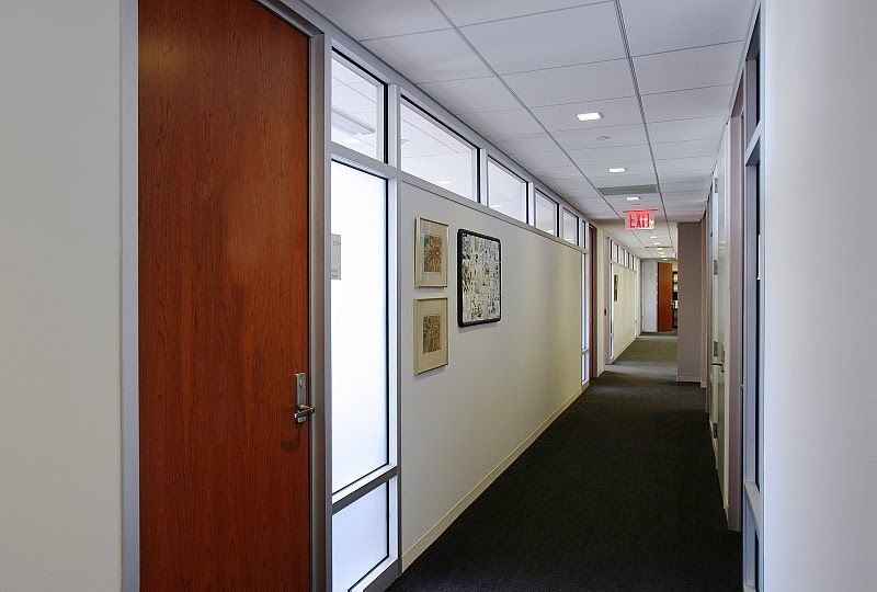 Aluminum stile and rail doors offers a window into the space allowing natural light to filter into the offices.